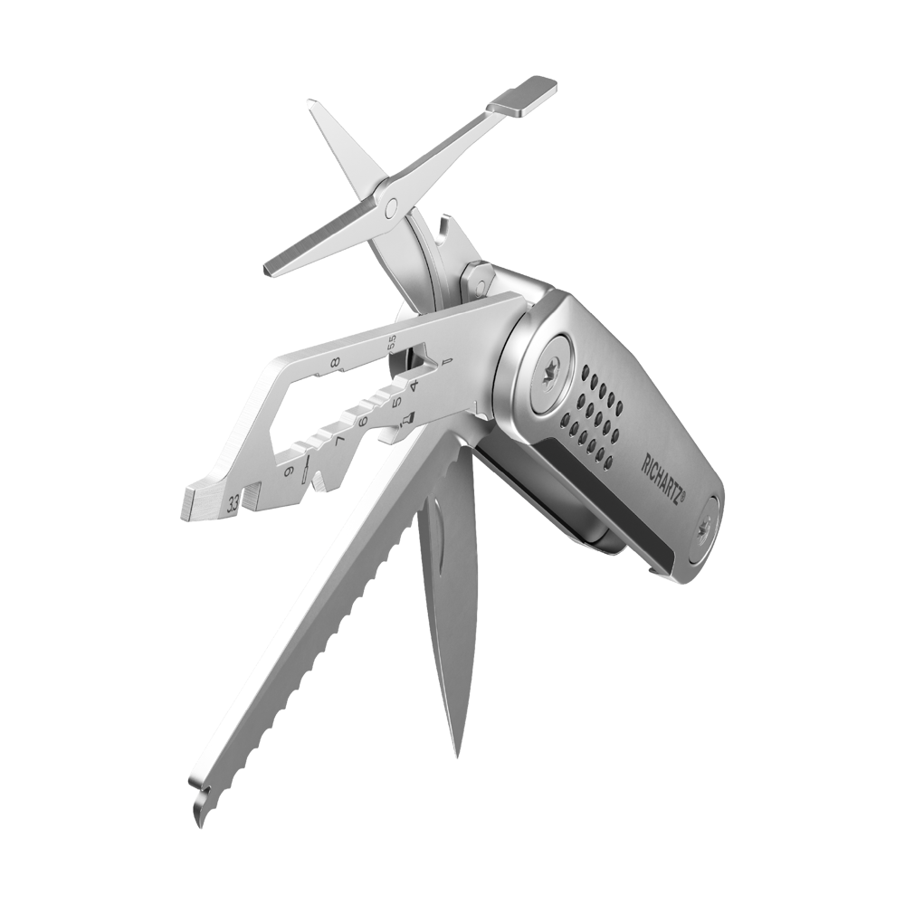 Das Taschenmesser, neu gedacht - und mit 15 Funktionen für alle Lebenslagen ausgestattet: darunter Klinge, Säge, Kapselheber, Schere, Schlitzschraubendreher, Fahrradspeichenschlüssel, Sechskantschlüssel (5), Vielzahnschlüssel (2), Kabelabzieher, Nagelzieher. Der Clou: Alle Funktionen sind auf einer Seite angebracht und können arretiert werden. So lässt es sich besser und sicherer arbeiten als mit klassischen Ausgaben des Taschenmessers. Noch Fragen?