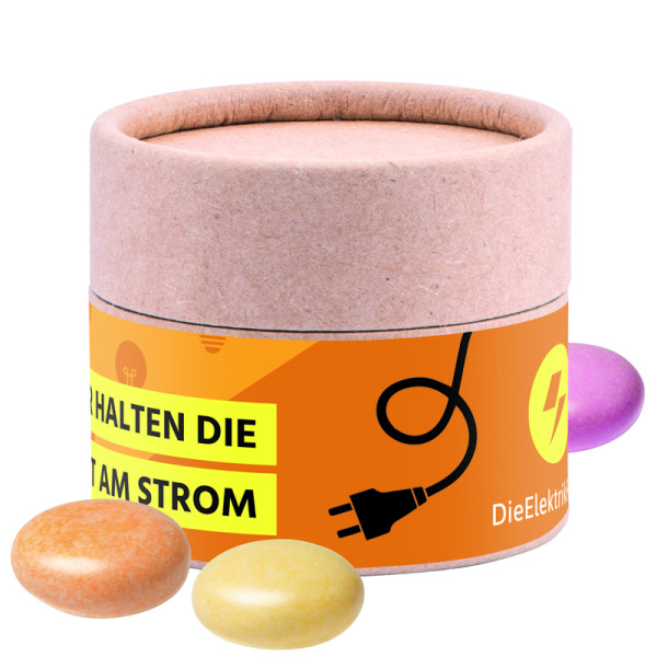 Papierdose Eco Mini, kompostierbar, rundum mit Papieretikett, individuell bedruckt. Mit Originalitätsverschluss. Inhalt: Mentos Kaudragee Fruit (Erdbeere, Orange, Zitrone - gemischt), 50 g