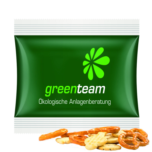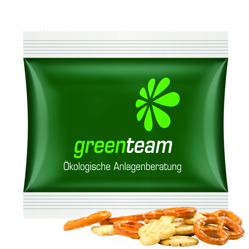 Snack Miditüte aus weißer Folie, individuell bedruckt. Inhalt: Knabbermix, 10 g Kartons à 150... mehr