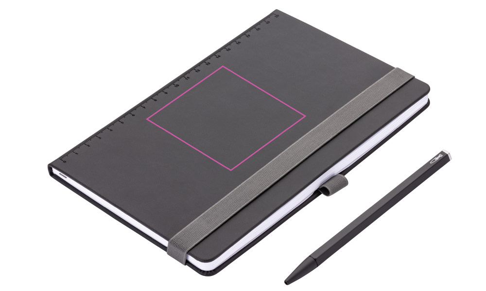 Notizblock DIN A5 inkl. Kugelschreiber, Elastikband-Verschluss, Stiftschlaufe, Lesezeichen, geprägtes Lineal (20 cm) auf Cover, FSC zertifiziertes Papier, 64 perforierte Blätter (128 Seiten), Punktraster, Fach für Belege, Kugelschreiber CONSTRUCTION BASIC (schwarze D1 Mine), Kunstleder, Metall, matt, schwarz