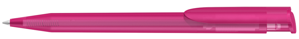 Druckkugelschreiber mit transparent gefrostetem Gehäuse und Clipdrücker.