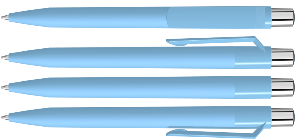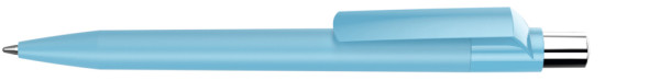 Druckkugelschreiber mit Softtouch-Schaft, gedeckt glänzendem Clip, silber glänzendem Drücker und farbigem Stopfen.
