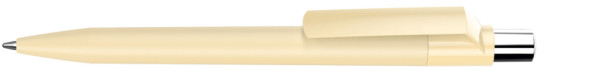 Druckkugelschreiber mit Softtouch-Schaft, gedeckt glänzendem Clip, silber glänzendem Drücker und farbigem Stopfen.