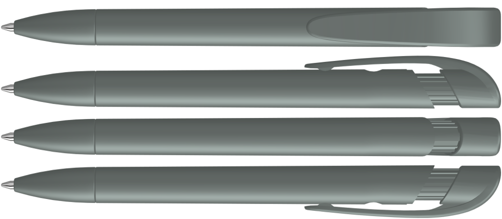 Druckkugelschreiber mit gedeckt mattem Gehäuse, breitem Bogenclipdrücker und Spitze.