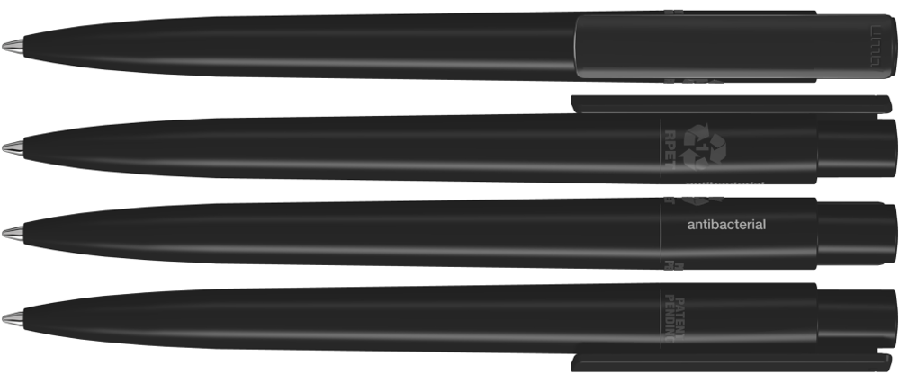 Druckkugelschreiber aus recyceltem, antibakteriellem und antiviralem rPET in gedeckt glänzendem Gehäuse und Clip. Der nach ISO 22196 und ISO 21702 geprüfte antimikrobielle Zusatz verleiht dem rPET eine antibakterielle und antivirale Wirkung auch gegen Corona-Viren. Die Haftung und Ansiedlung von Bakterien oder Krankheitserregern auf der Oberfläche des Schreibgerätes wird um 99,99% verringert. Der in das rPET Material eingearbeitete antimikrobielle Zusatz kann nicht abgerieben oder abgegeben werden und wirkt über die gesamte Lebensdauer des Schreibgerätes. Eine dauerhafte Reduzierung von Krankheitserregern ist gegeben.