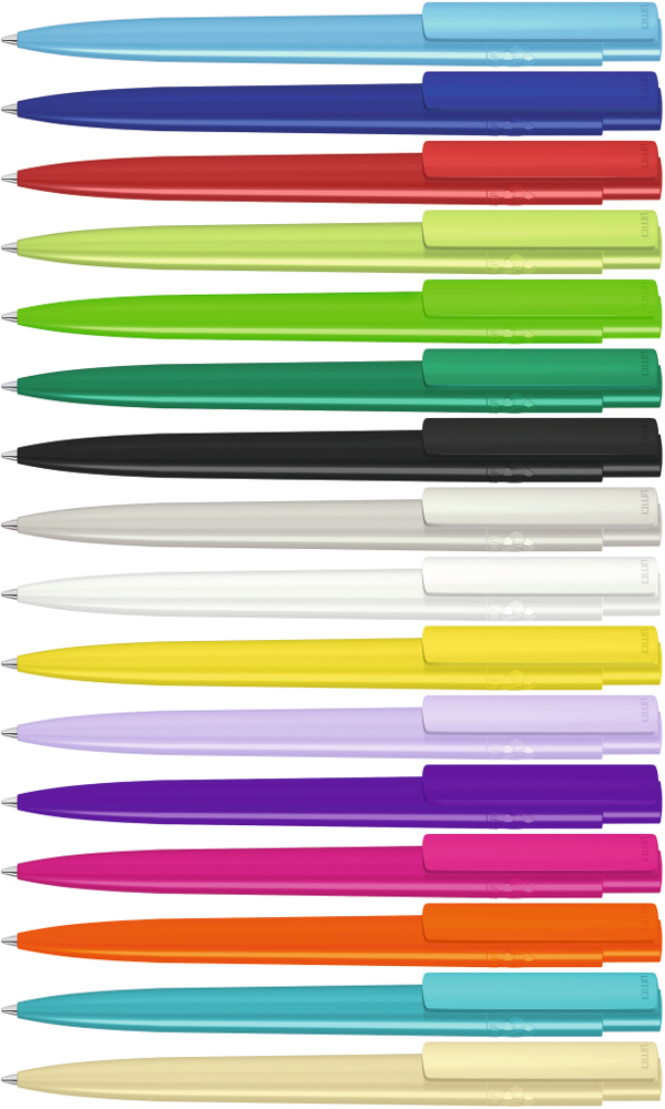 Druckkugelschreiber aus recyceltem PET-Material mit gedeckt glänzendem Gehäuse und Clip.