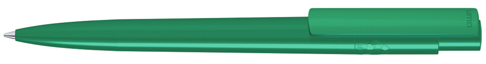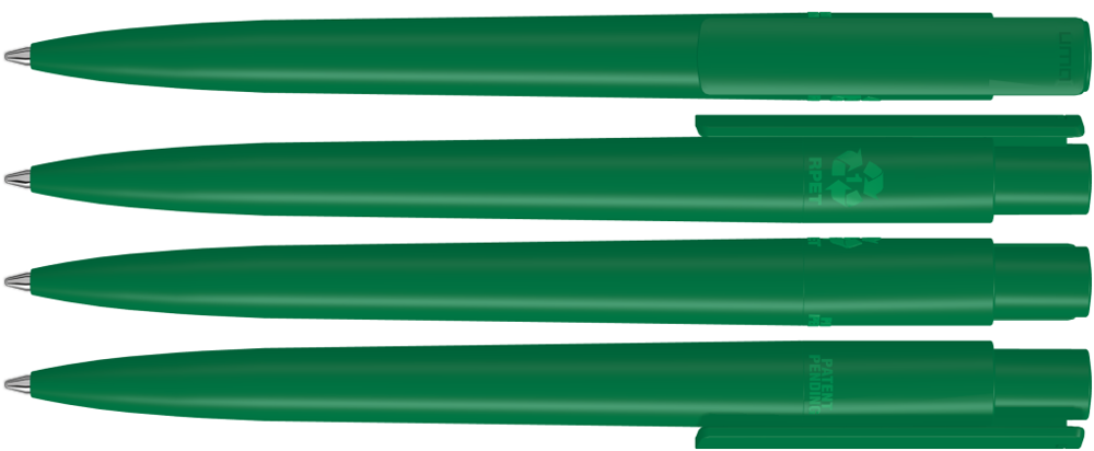 Druckkugelschreiber aus recyceltem PET-Material mit gedeckt glänzendem Gehäuse und Clip.