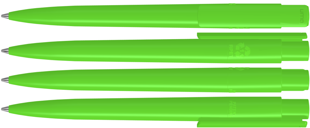 Druckkugelschreiber aus recyceltem PET-Material mit gedeckt glänzendem Gehäuse und Clip.