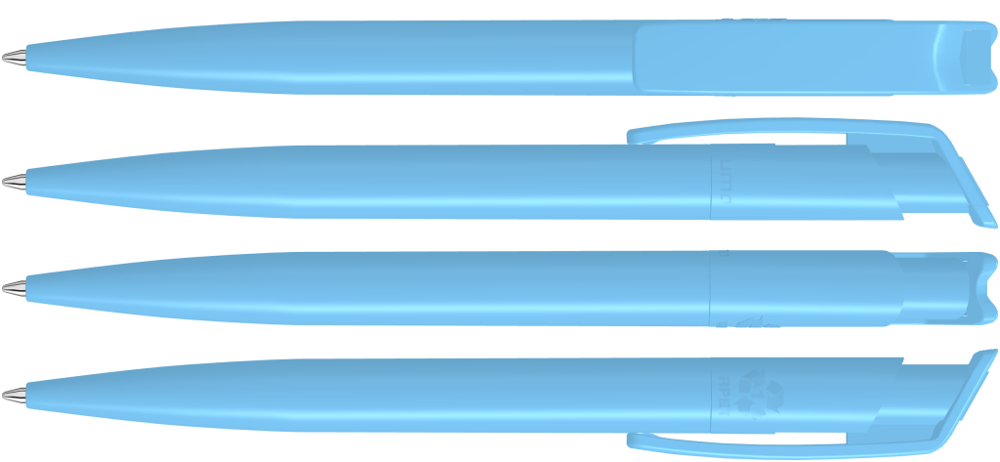 Druckkugelschreiber aus recyceltem PET-Material mit gedeckt glänzendem Gehäuse und Stopfen.
