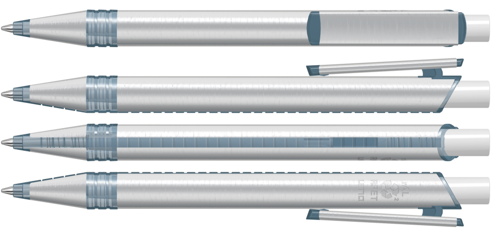 Metall-Druckkugelschreiber mit Metallspitze, Metallschaft und Metallclip aus recyceltem Aluminium, Kunststoffteile aus recyceltem PET-Material in klar transparent und gedeckt farbigem Drücker.