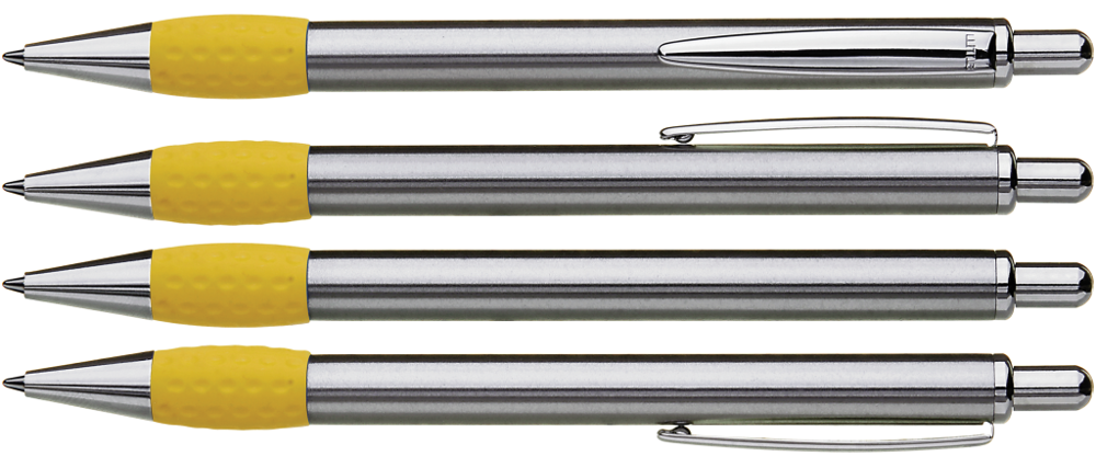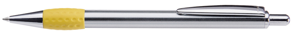 Metall-Druckkugelschreiber mit Schaft, Drücker, Clip und Spitze glanzverchromt. Gummigriffzone farbig.