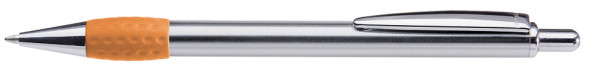Metall-Druckkugelschreiber mit Schaft, Drücker, Clip und Spitze glanzverchromt. Gummigriffzone farbig.