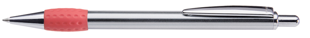 Metall-Druckkugelschreiber mit Schaft, Drücker, Clip und Spitze glanzverchromt. Gummigriffzone farbig.