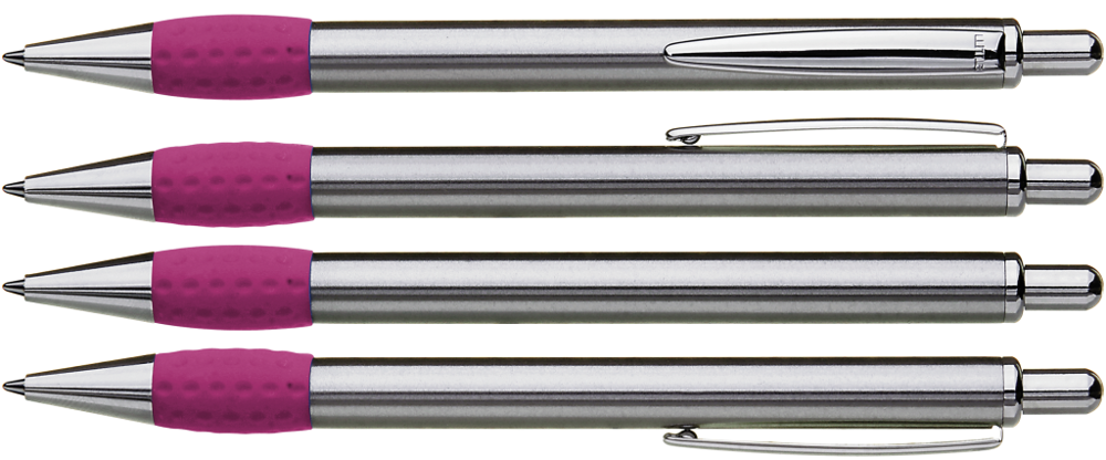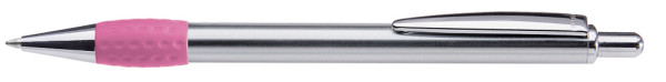 Metall-Druckkugelschreiber mit Schaft, Drücker, Clip und Spitze glanzverchromt. Gummigriffzone farbig.