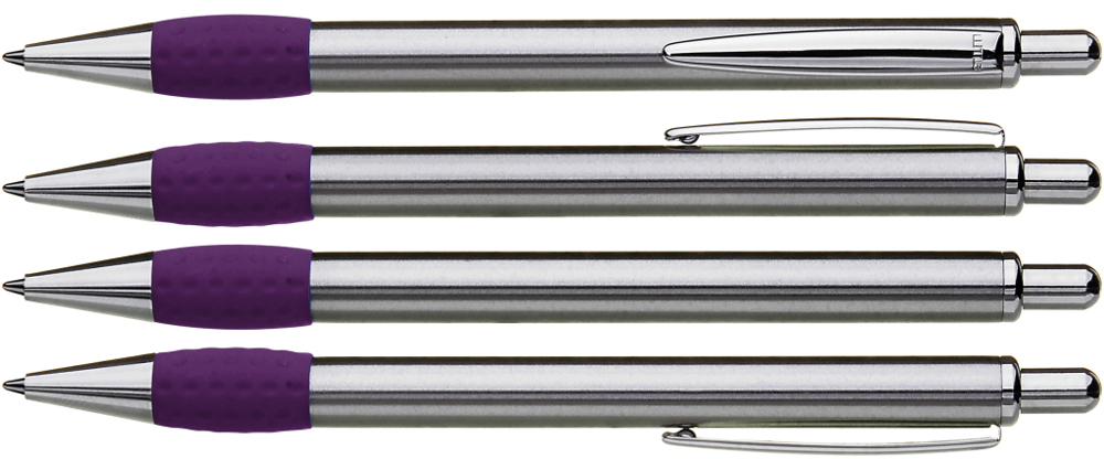 Metall-Druckkugelschreiber mit Schaft, Drücker, Clip und Spitze glanzverchromt. Gummigriffzone farbig.
