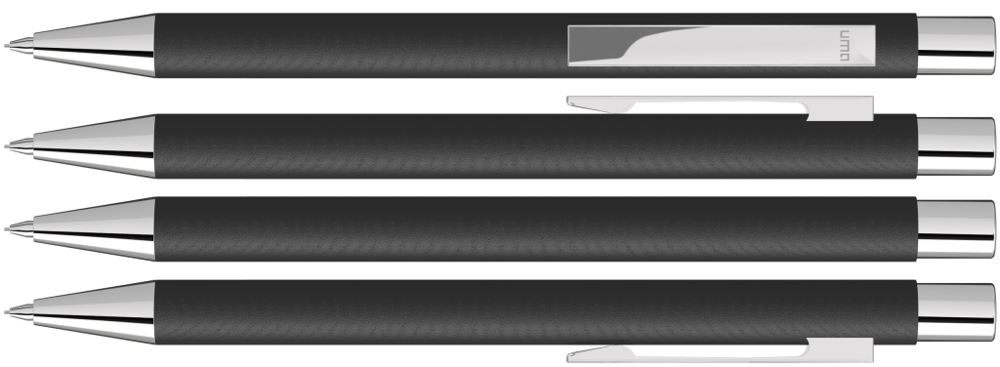 Metall-Druckbleistift (0,7mm) mit mattem Gehäuse. Metallclip, Metallspitze und Drücker silber glänzend. Radiergummi im Drücker.