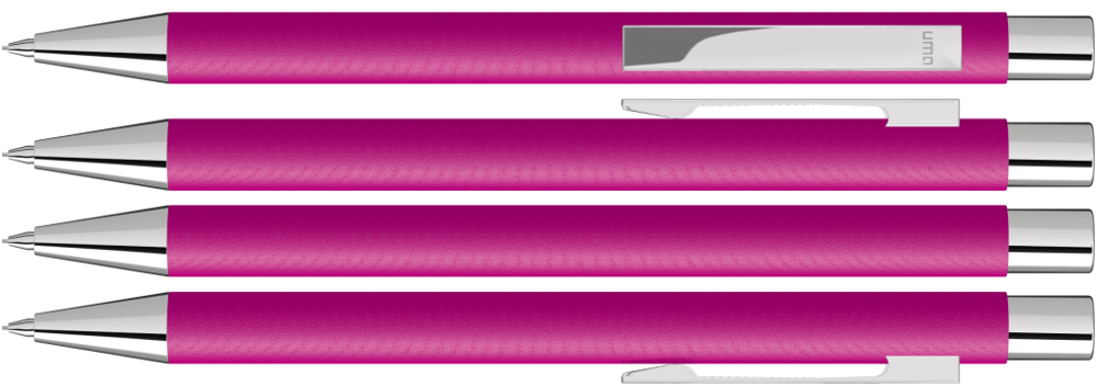 Metall-Druckbleistift (0,7mm) mit mattem Gehäuse. Metallclip, Metallspitze und Drücker silber glänzend. Radiergummi im Drücker.