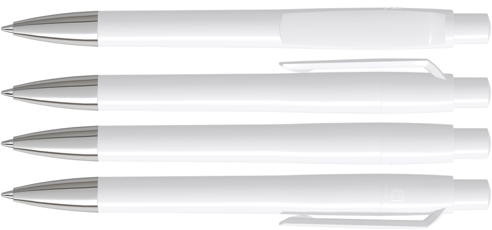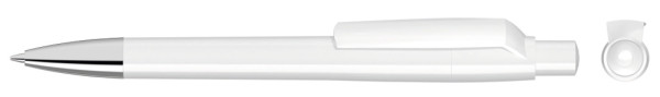 Druckkugelschreiber mit gedeckt glänzendem Gehäuse, Clip, Drücker und Stopfen. Spitze glanzverchromt.