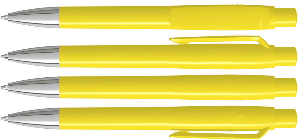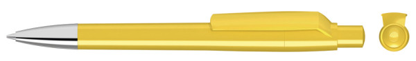 Druckkugelschreiber mit gedeckt glänzendem Gehäuse, Clip, Drücker und Stopfen. Spitze glanzverchromt.
