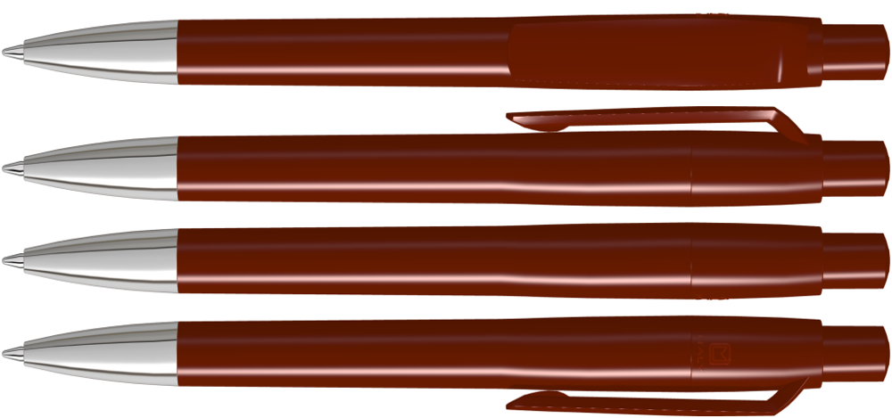Druckkugelschreiber mit gedeckt glänzendem Gehäuse, Clip, Drücker und Stopfen. Spitze glanzverchromt.