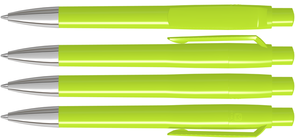 Druckkugelschreiber mit gedeckt glänzendem Gehäuse, Clip, Drücker und Stopfen. Spitze glanzverchromt.
