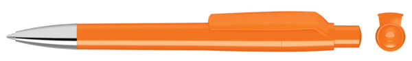 Druckkugelschreiber mit gedeckt glänzendem Gehäuse, Clip, Drücker und Stopfen. Spitze glanzverchromt.