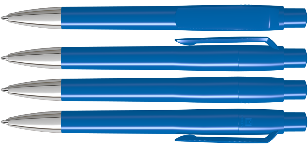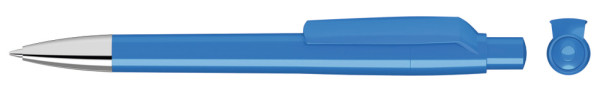 Druckkugelschreiber mit gedeckt glänzendem Gehäuse, Clip, Drücker und Stopfen. Spitze glanzverchromt.