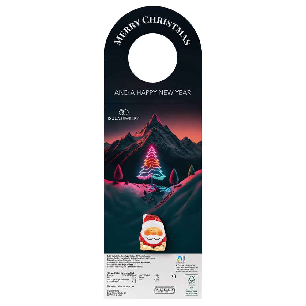 Werbeanhänger komplett aus weißem Karton, individuell bedruckt. Inhalt: 1 kleiner Riegelein Schoko-Weihnachtsmann, Edelvollmilchschokolade, 5 g