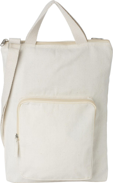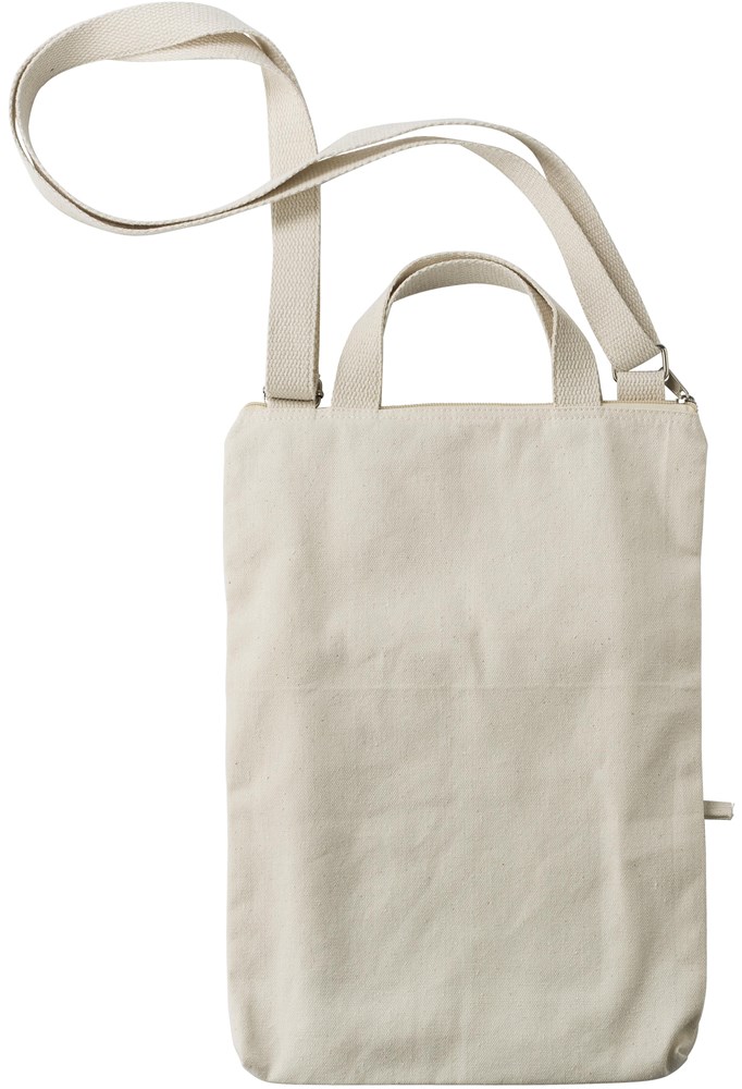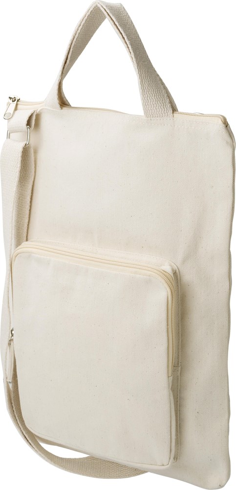 Laptoptasche aus Baumwolle (340 g/m²) (15 Zoll). Ein großes Fach mit Reißverschluss, kleine Fronttasche mit Reißverschluss. Zwei kurze Griffe und ein verstellbarer Schultergurt.