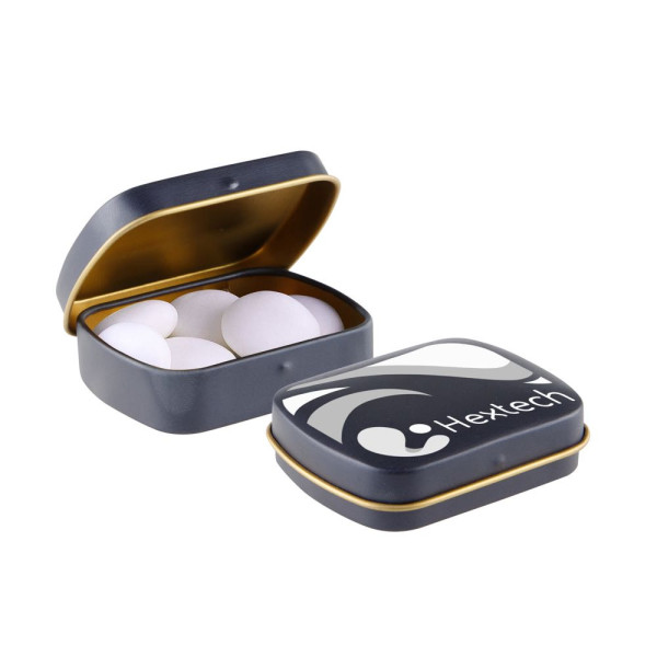 Mini Klappdeckeldose in matt dunkelblau mit goldener Innenseite und ca. 28 Gramm Mentos. Mit Vollfarbdruck, Inhaltsstoffaufkleber und Siegel.