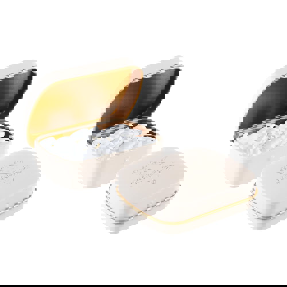 Mini Klappdeckeldose matt sand mit goldener Innenseite und ca. 23 Gramm Pfefferminz. Und mit Prägung. Inklusive Inhaltsstoffaufkleber und Siegel.