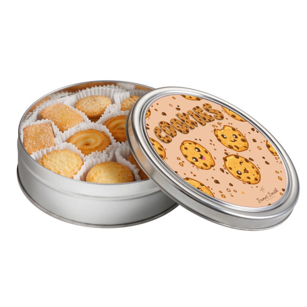 Runde Dose Keks-Mix 340 Gramm, mit 4c-Euroskala bedrucktem Aufkleber mehr