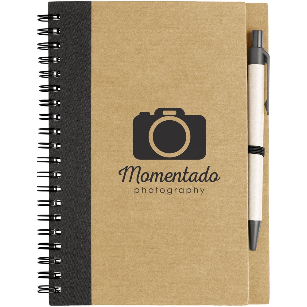 Notizbuch mit Deckel aus Recyclingkarton, 60 Blatt liniertem Recyclingpapier und passendem Stift. Das Notizbuch und der Stift sind zusammen verpackt.