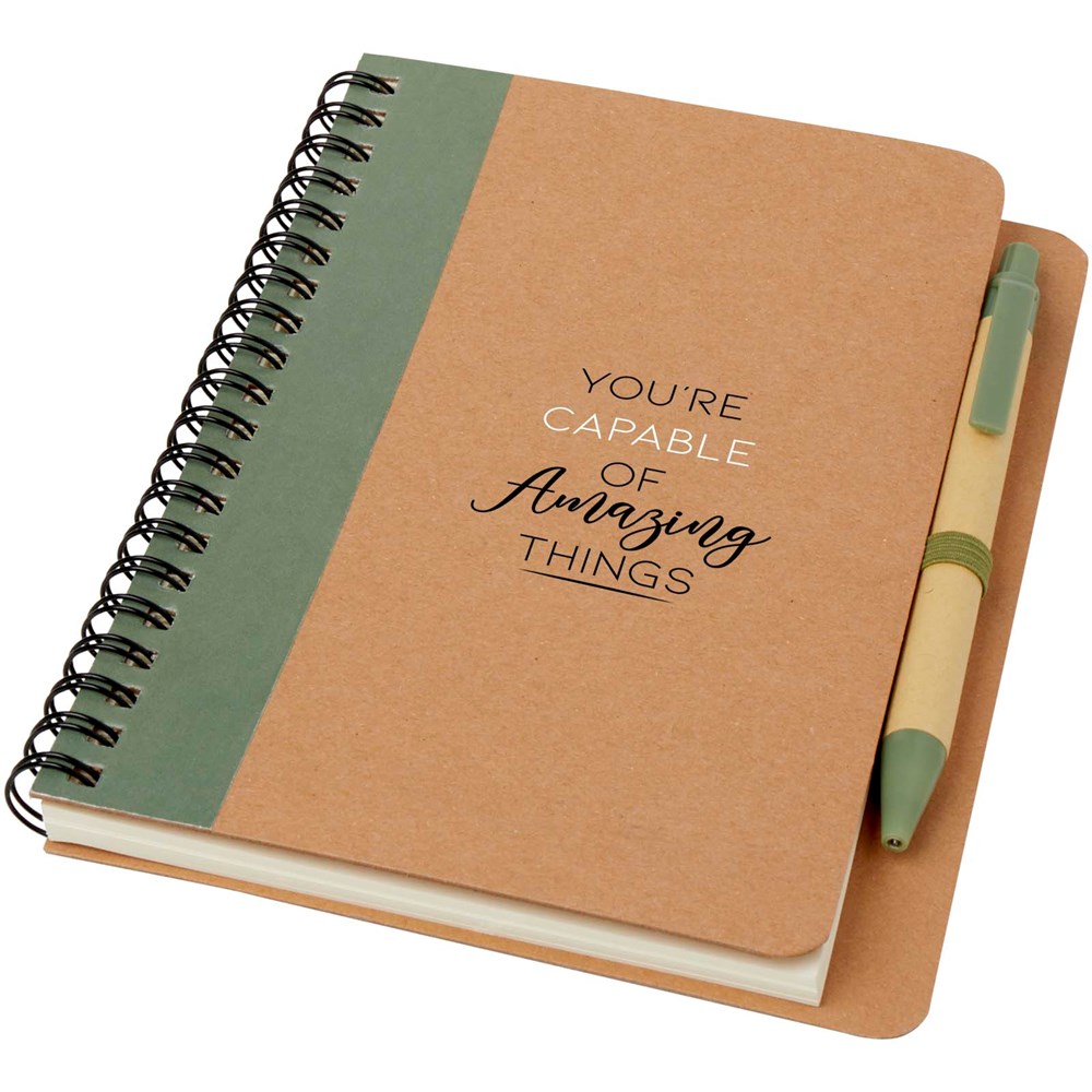 Notizbuch mit Deckel aus Recyclingkarton, 60 Blatt liniertem Recyclingpapier und passendem Stift. Das Notizbuch und der Stift sind zusammen verpackt.