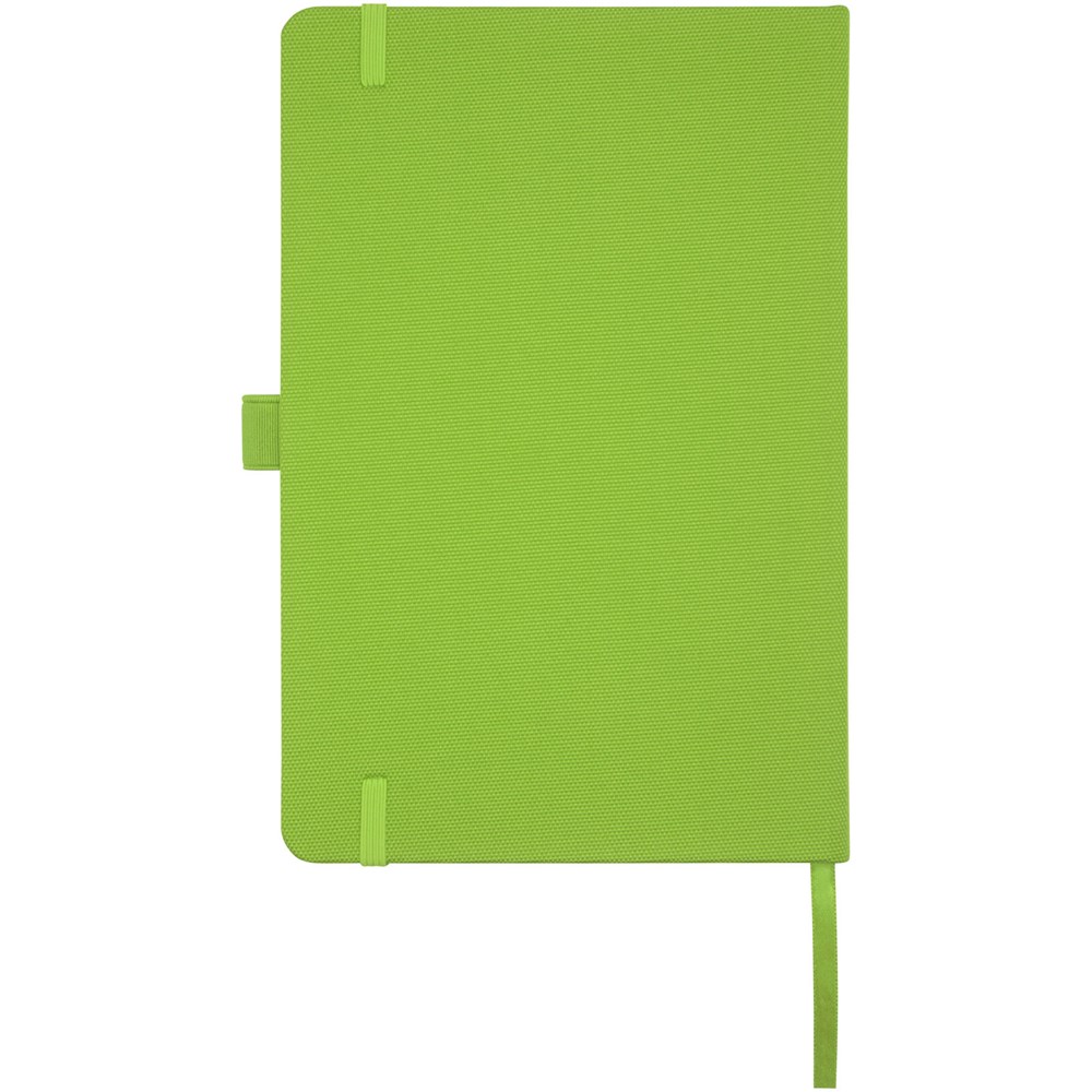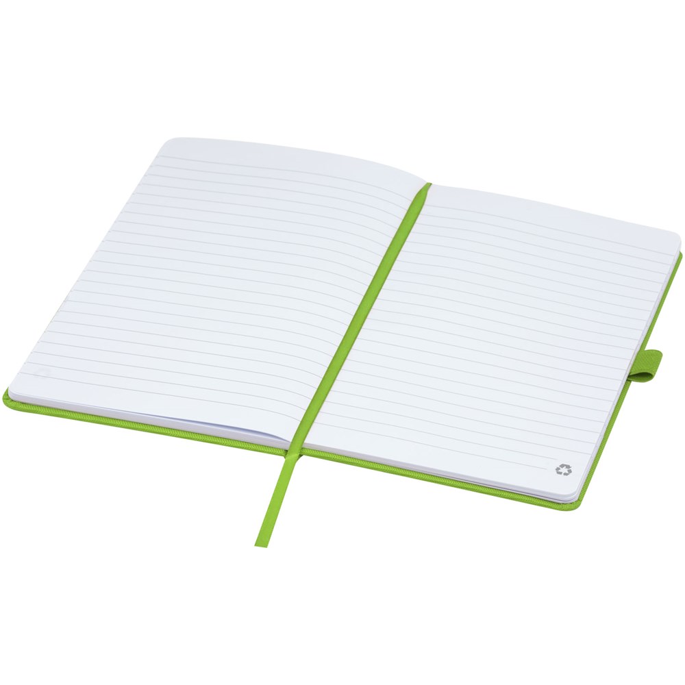 A5 Notizbuch mit einem Cover aus RPET. Mit 80 Blatt, 70 g/m² recyceltem Papier, liniert, und mit Stiftschlaufe und Leseband.