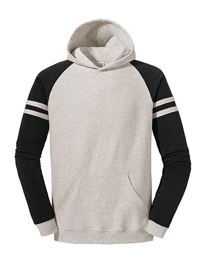 NuBlend® vorgeschrumpftes, pilling-resistentes 2-Enden-Fleece | Hergestellt aus nachhaltig erzeugter, in den USA angebauter Baumwolle | Hohe Maschendichte für eine glatte Druckfläche | Body in Oatmeal Heather für einen modernen, gleichzeitig zurückhaltenden Look | Kontrastfarbene Raglanärmel | Sportlich inspirierte College-Streifen an den Ärmeln | Kängurutasche vorne | Ärmelbündchen und Bund aus 1x1-Rippstrick (Ärmelbündchen passen zu den College-Streifen) | Vierteldrehung zur Vermeidung der Mittelfalte