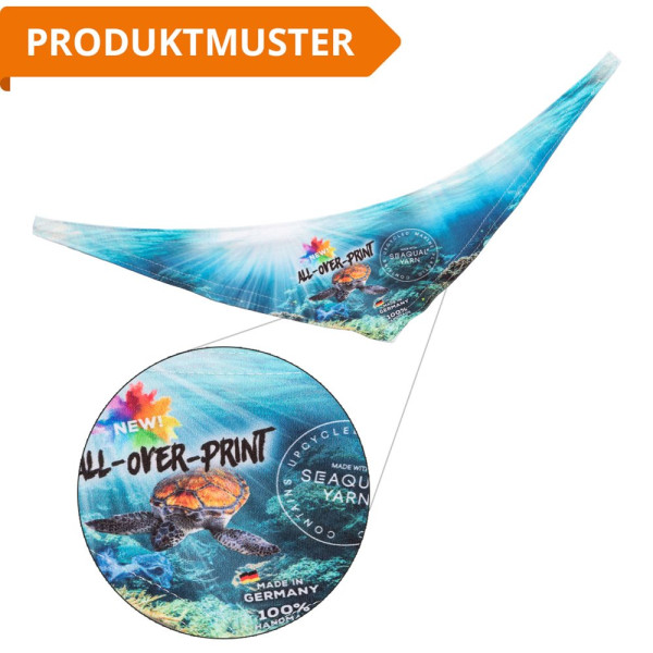 Ein Dreiecktuch ist bei sitzenden Tieren, die einen T-Shirt-Aufdruck mit ihren Vorderbeinen verdecken würden, die richtige Wahl, um Werbung optimal in Szene zu setzen. Das Dreiecktuch All-Over-Print besteht aus recyceltem Plastik, u. a. Upcycled Marine Plastic aus den Weltmeeren. Hiermit lassen sich auffallende Accessoires basierend auf Arbeitskleidung, Saisons, Jahreszeiten, Events oder nahezu allen fotorealistischen Motiven erstellen. Erhältlich in verschiedenen Größen. Stylish für Ihre Kunden, gut für unsere Umwelt!