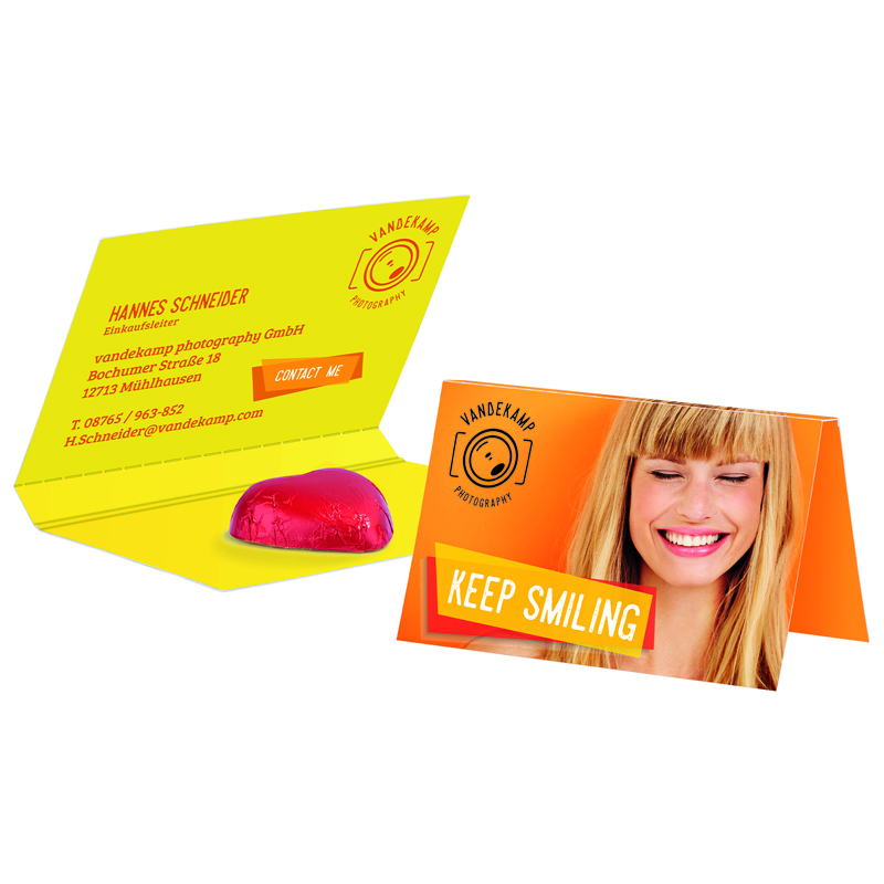 Aufklappbare Werbekarte im Visitenkartenformat, weißer Karton, mit praktischer Abreißperforation, individuell bedruckt. Inhalt: 1 Storz Schokoherz aus Edelvollmilchschokolade, 5 g