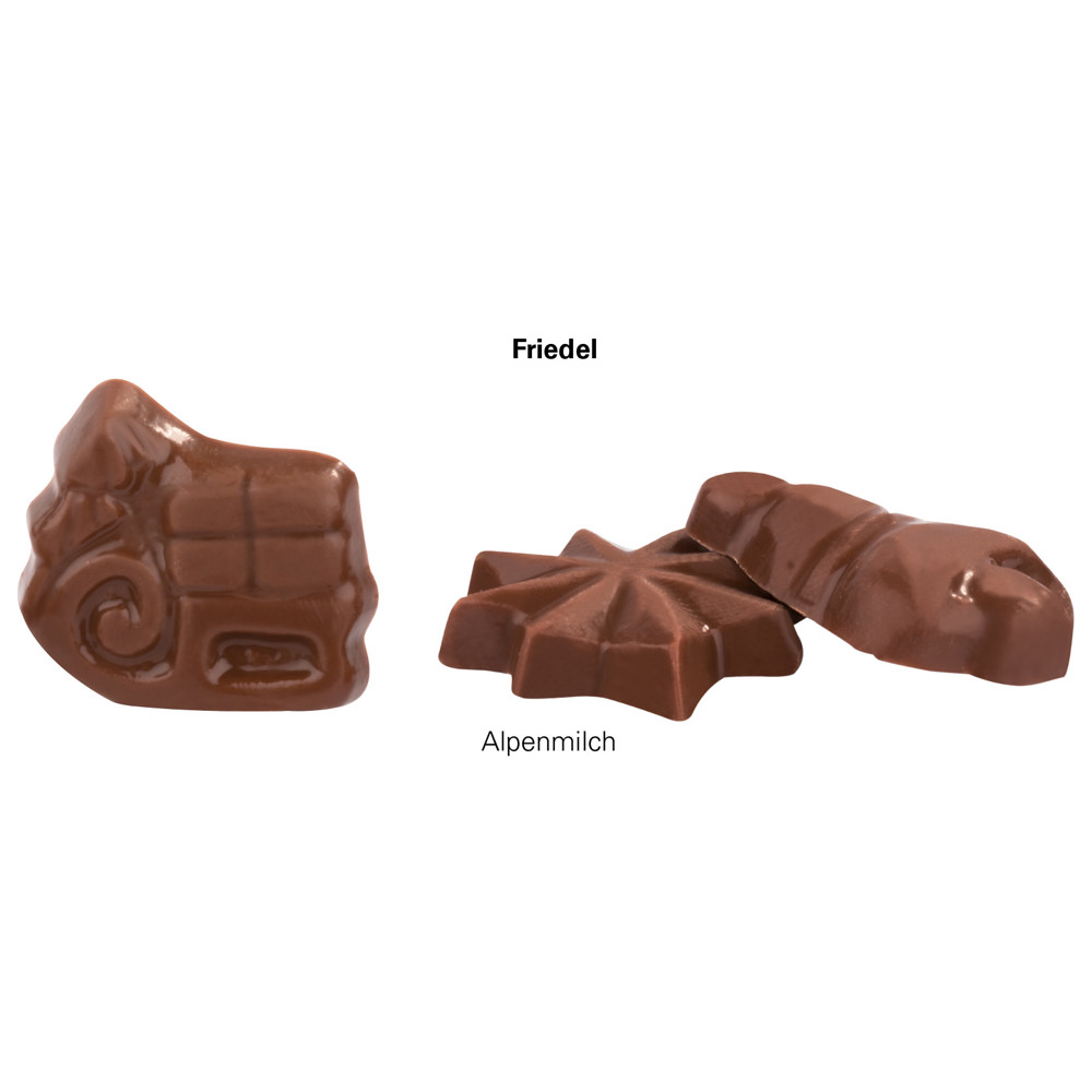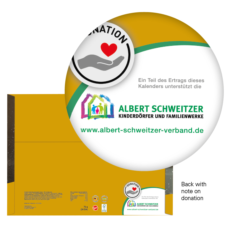 Wand Adventskalender in Kartonhülle aus Graspapier, Hochformat, recycelbar, individuell bedruckt. Ein Teil des Ertrags dieses Kalenders unterstützt die Albert Schweitzer Kinderdörfer und Familienwerke. Inhalt: 24 Friedel Vollmilch Schokoladentäfelchen, 70 g