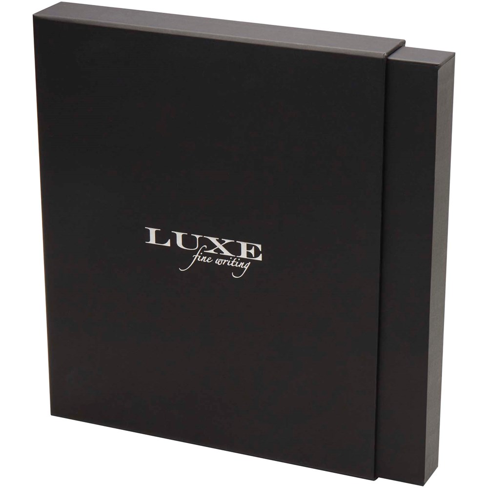 Der Legato ist eine elegante Kombination aus einem Notizbuch im Format A5 und einem Tintenroller. Der Tintenroller hat einen oberen Schaft aus recyceltem Messing mit goldfarbener Verchromung, einen unteren Schaft mit schwarz/brauner Pulverbeschichtung, goldfarbene Metallaccessoires und ein LUXE-Logo auf dem mittleren Ring. Tintenfarbe: Schwarz. Schreiblänge: 400 Meter. Strichstärke: 0,7 mm. Das Notizbuch hat 80 Blatt liniertes Papier (80 g/m²), einen Einband aus recyceltem Kunststoff, einen elastischen Verschluss, ein Lesebändchen und eine Ziehharmonikatasche. Der elastische Verschluss ist mit einem goldfarbenen Metallaccessoire versehen. Verpackt in einer Geschenkbox aus recyceltem Karton.