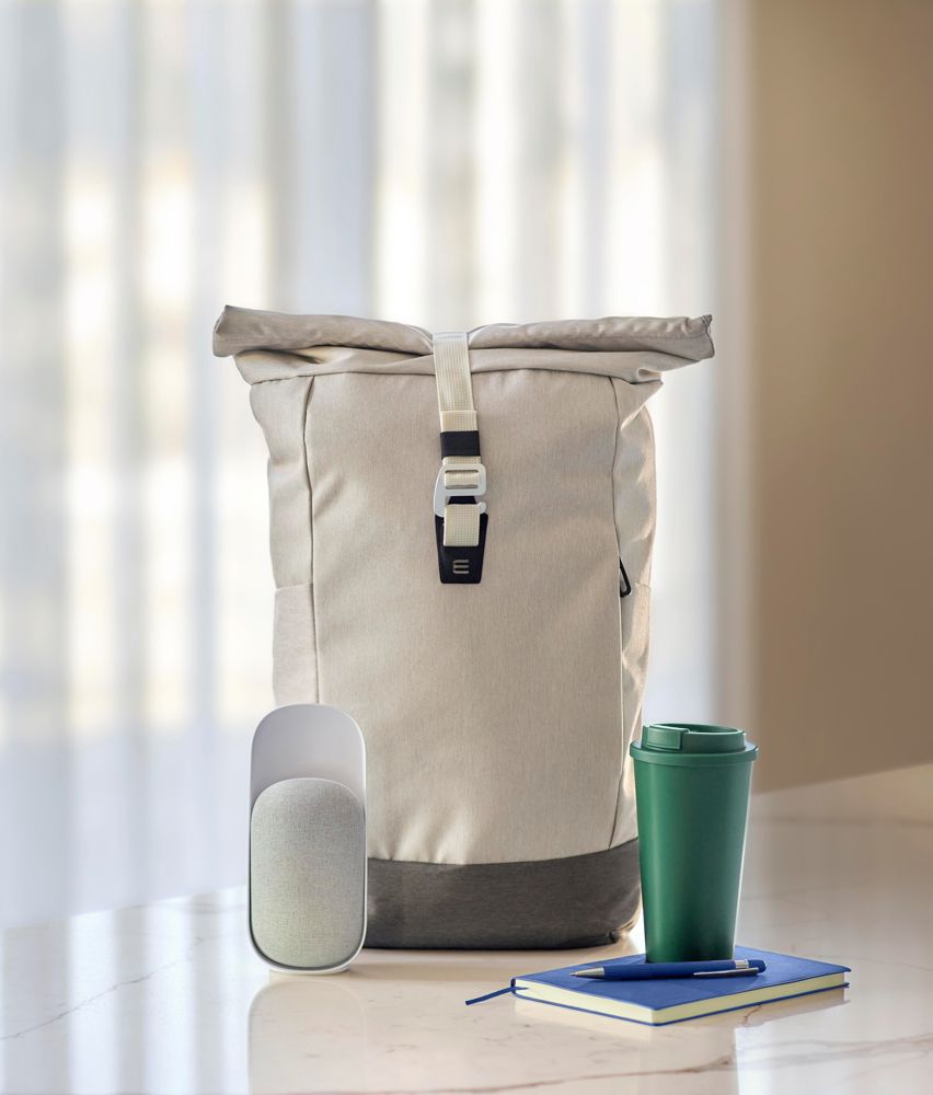 Rucksack aus rPET (600D) mit Rolltop und einer großen Reißverschlusstasche auf der Oberseite sowie einer großen Reißverschlusstasche auf der Vorderseite. Der Rucksack hat verstellbare Schultergurte und eine Kunststoffschnalle zum Verschließen des Rolltops.