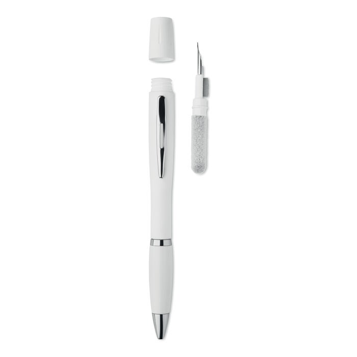 Kugelschreiber mit Reinigungs-Set für TWS-Ohrhörer: Metallspitze, Schwamm und Bürste. Blaue Tinte. mehr
