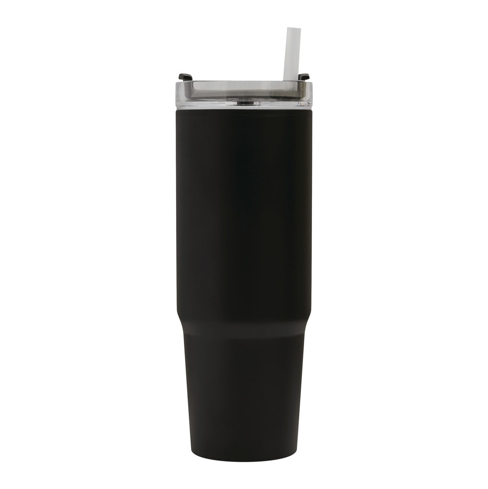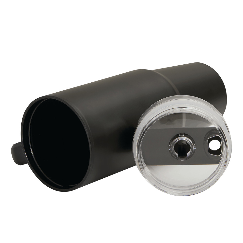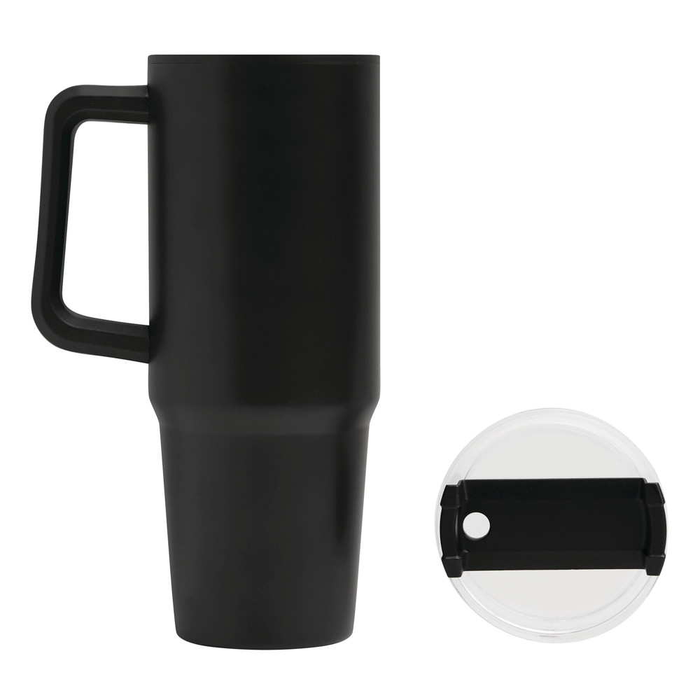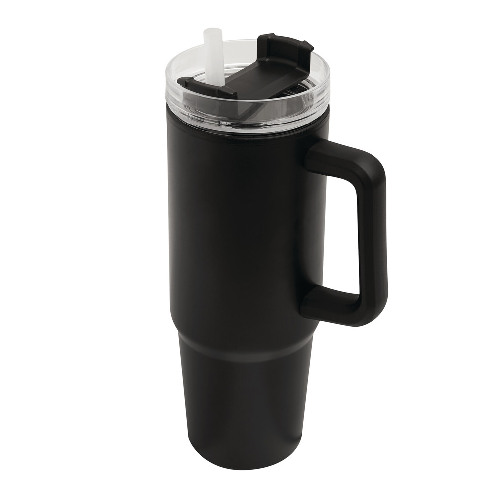 Trinkbecher DRINK ULTY, doppelwandig: innen aus Kunststoff und außen aus Edelstahl, mit praktischem Griff, transparenter Kunststoff-Deckel mit sicherem Schraubverschluss, Silikon-Dichtring, Trinköffnung mit Drehverschluss und transparentem Strohhalm, beschichteter Boden für gute Oberflächenhaftung, Füllmenge ca. 900 ml, hält ca. 2 Stunden warm und bis zu 4 Stunden kalt, in Box