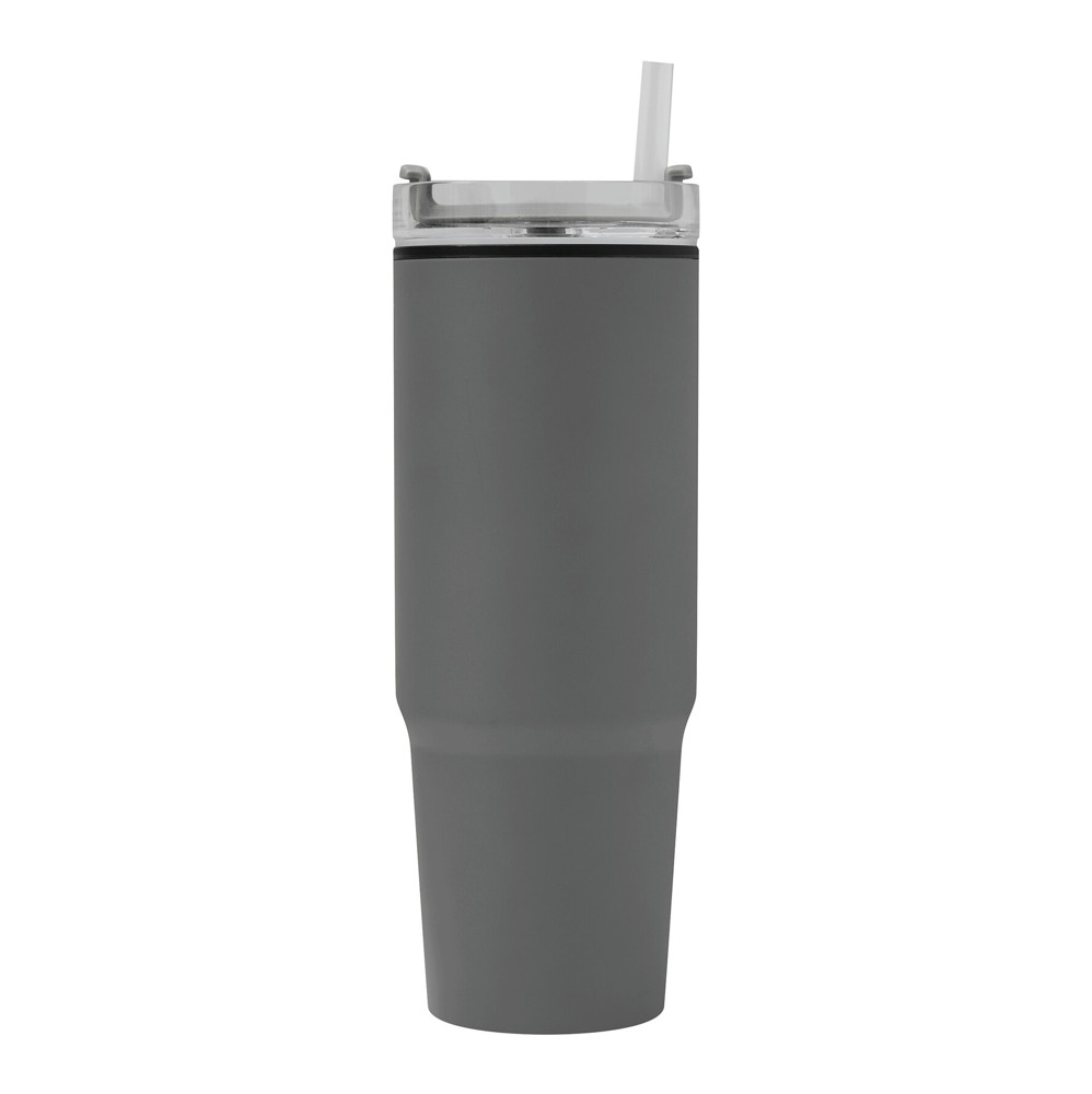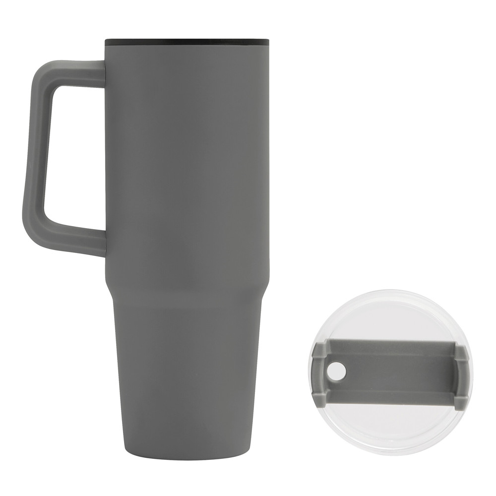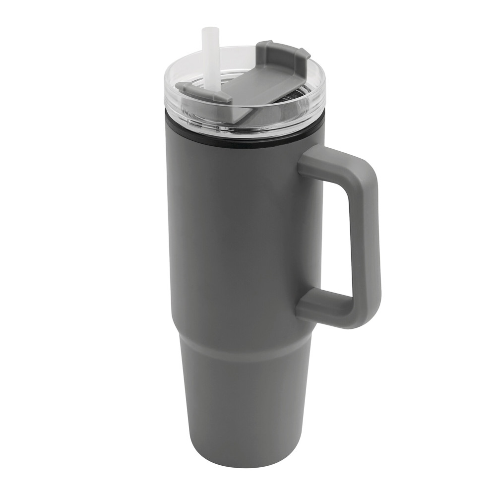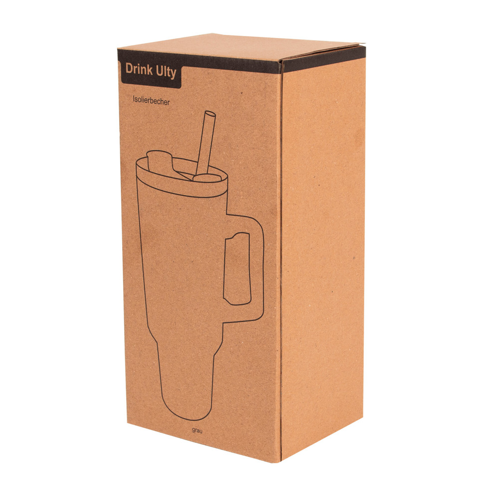 Trinkbecher DRINK ULTY, doppelwandig: innen aus Kunststoff und außen aus Edelstahl, mit praktischem Griff, transparenter Kunststoff-Deckel mit sicherem Schraubverschluss, Silikon-Dichtring, Trinköffnung mit Drehverschluss und transparentem Strohhalm, beschichteter Boden für gute Oberflächenhaftung, Füllmenge ca. 900 ml, hält ca. 2 Stunden warm und bis zu 4 Stunden kalt, in Box