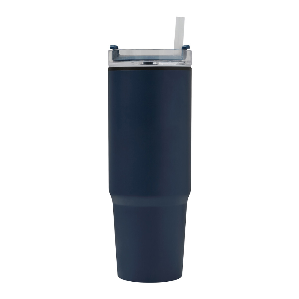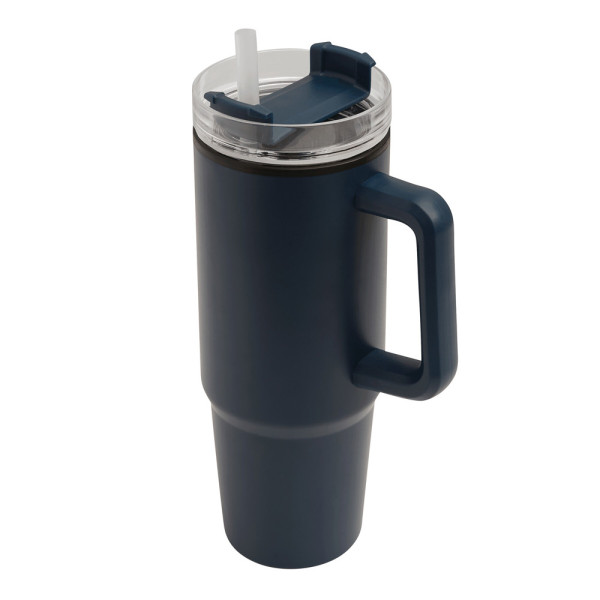 Trinkbecher DRINK ULTY, doppelwandig: innen aus Kunststoff und außen aus Edelstahl, mit praktischem Griff, transparenter Kunststoff-Deckel mit sicherem Schraubverschluss, Silikon-Dichtring, Trinköffnung mit Drehverschluss und transparentem Strohhalm, beschichteter Boden für gute Oberflächenhaftung, Füllmenge ca. 900 ml, hält ca. 2 Stunden warm und bis zu 4 Stunden kalt, in Box