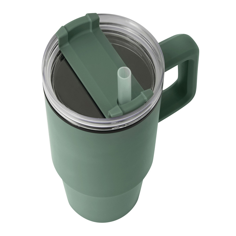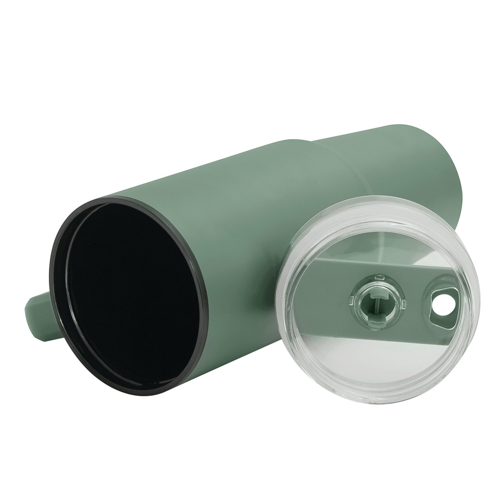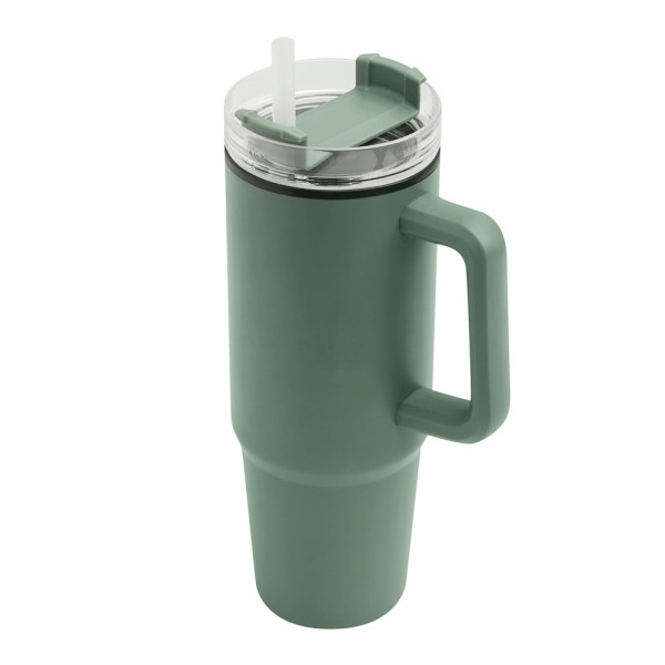Trinkbecher DRINK ULTY, doppelwandig: innen aus Kunststoff und außen aus Edelstahl, mit praktischem Griff, transparenter Kunststoff-Deckel mit sicherem Schraubverschluss, Silikon-Dichtring, Trinköffnung mit Drehverschluss und transparentem Strohhalm, beschichteter Boden für gute Oberflächenhaftung, Füllmenge ca. 900 ml, hält ca. 2 Stunden warm und bis zu 4 Stunden kalt, in Box