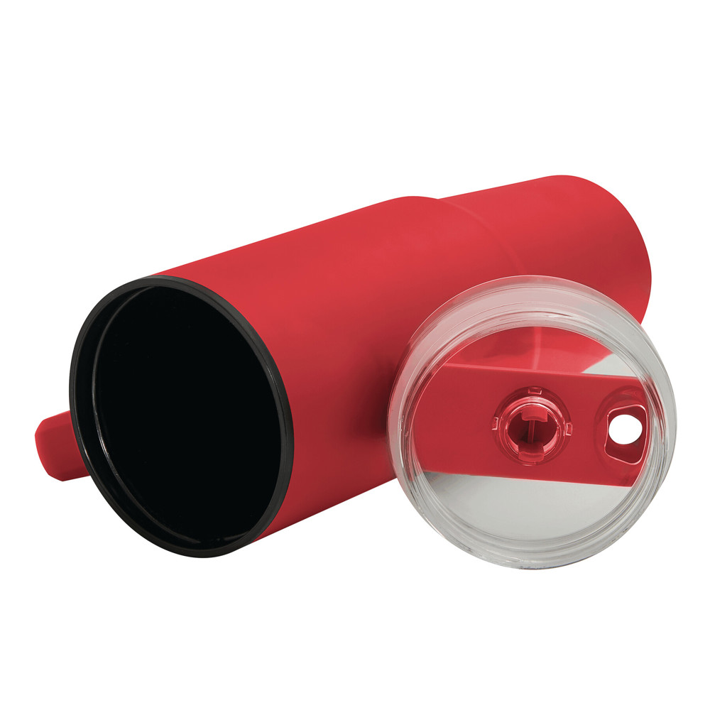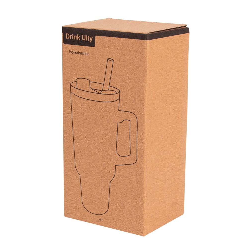 Trinkbecher DRINK ULTY, doppelwandig: innen aus Kunststoff und außen aus Edelstahl, mit praktischem Griff, transparenter Kunststoff-Deckel mit sicherem Schraubverschluss, Silikon-Dichtring, Trinköffnung mit Drehverschluss und transparentem Strohhalm, beschichteter Boden für gute Oberflächenhaftung, Füllmenge ca. 900 ml, hält ca. 2 Stunden warm und bis zu 4 Stunden kalt, in Box