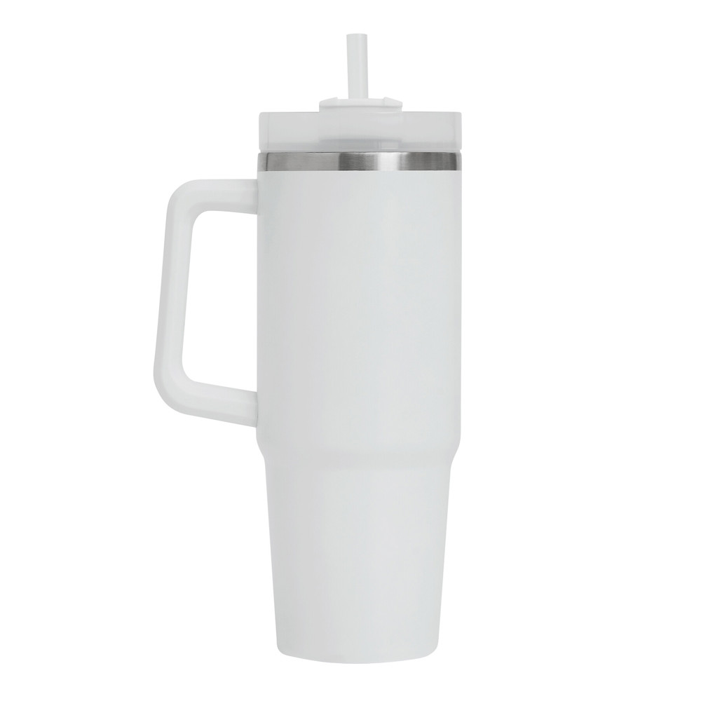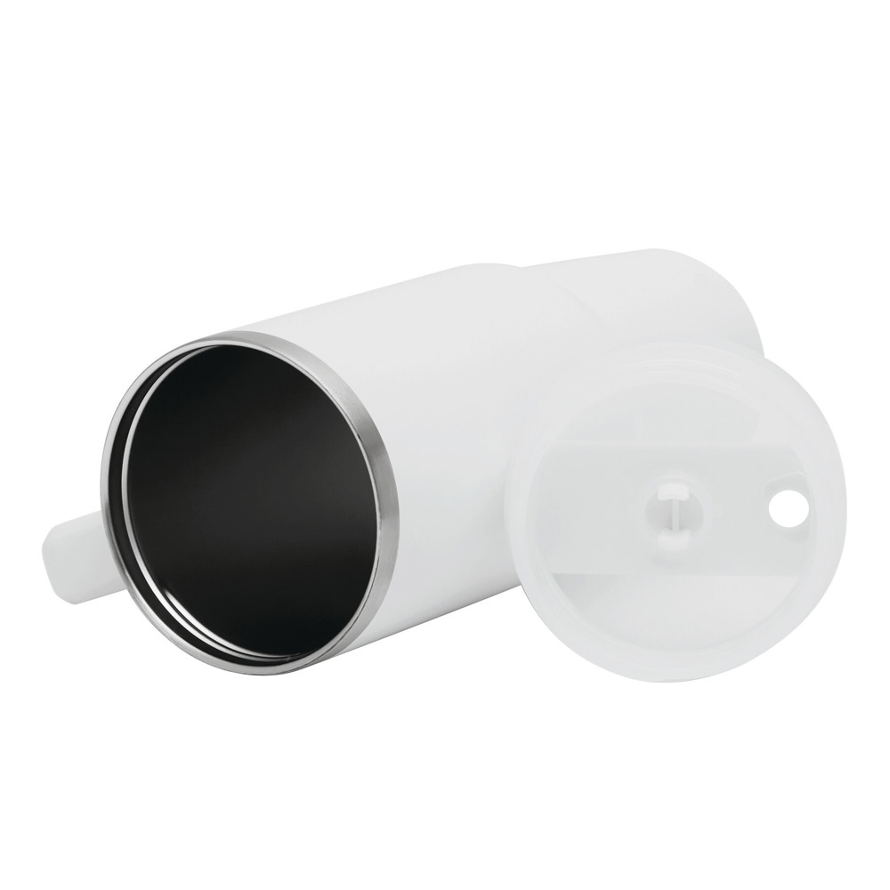 Vakuum-Isolierbecher DRINK DELUXE, doppelwandig: innen und außen aus Edelstahl, mit praktischem Griff, milchig-transparenter Kunststoff-Deckel mit sicherem Schraubverschluss, Silikon-Dichtring, Trinköffnung mit Drehverschluss und transparentem Strohhalm, beschichteter Boden für gute Oberflächenhaftung, Füllmenge ca. 900 ml, hält ca. 5 Stunden warm und bis zu 10 Stunden kalt, in Box