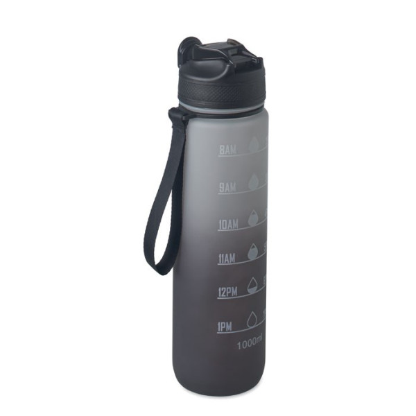 Sport-Trinkflasche aus RPET. Integrierter Trinkhalm, weiches Silikonmundstück, motivierende Zeitmarkierung, einhändig zu öffnender Flip-Top-Deckel, Sicherheitsverschluss und Schlaufe. Füllmenge: 1L.