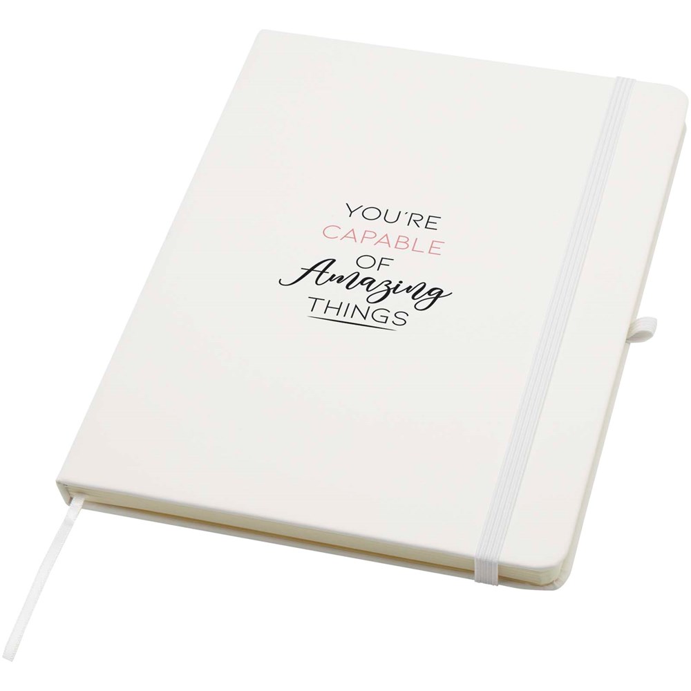 Das Spectrum Plus A5 Hardcover Notizbuch mit abgerundeten Ecken ist nicht nur ein unentbehrlicher Begleiter im Büro, sondern auch ein hervorragender Weg, um für Ihre Marke zu werben. Das Notizbuch aus Karton mit weichem Einband und 80 linierten, cremefarbenen Seiten (70 g/m²) eignet sich ideal für schnelle Ideen oder längere Notizen. Das Notizbuch ist mit Stiftschlaufe, elastischem Verschluss, Lesebändchen und erweiterbarrter Tasche ausgestattet.
